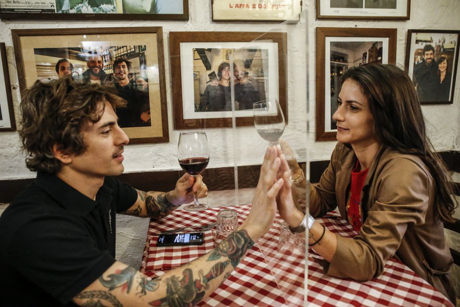 Μια πρώτη δοκιμή έκανε ο ιδιοκτήτης του εστιατορίου Il Ciak στην περιοχή Τραστέβερε της Ρώμης, που δοκίμασαν μια πιθανή νέα εγκατάσταση. Την τοποθέτηση πλέξιγκλας στην μέση του τραπεζιού ως διαχωριστικό. Το ζευγάρι κάθισε σε ένα τραπέζι δύο ατόμων και στο μέσο του τραπεζιού και κατά μήκος έχει τοποθετηθεί ένα κομμάτι πλέξιγκλας. Και μπορεί το διαχωριστικό να κάνει λιγότερο ρομαντικό αυτό το δείπνο, ωστόσο ο Βαλέριο Καλντερόνι (ο ιδιοκτήτης του εστιατορίου) και η σύζυγός του Μαρτίνα, έχουν άφθονο χώρο για το φαγητό τους και εξακολουθούν να μπορούν να τσουγκρίσουν τα ποτήρια τους