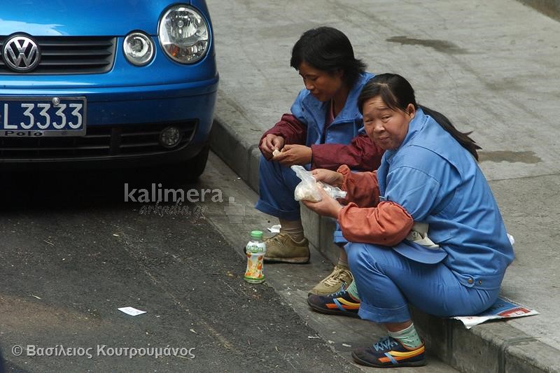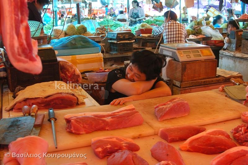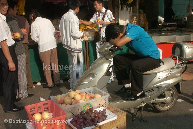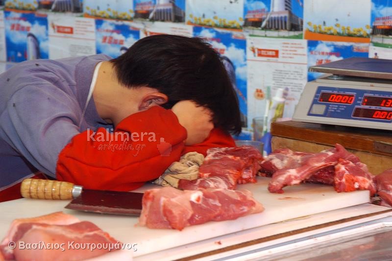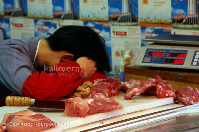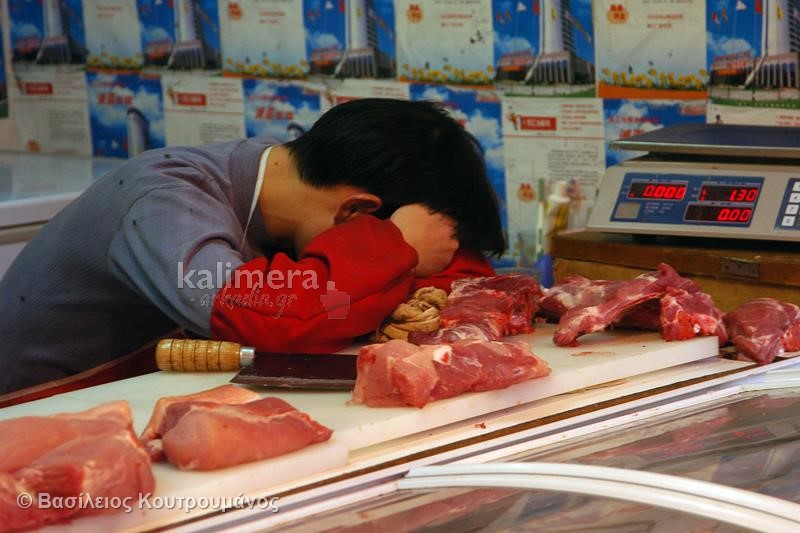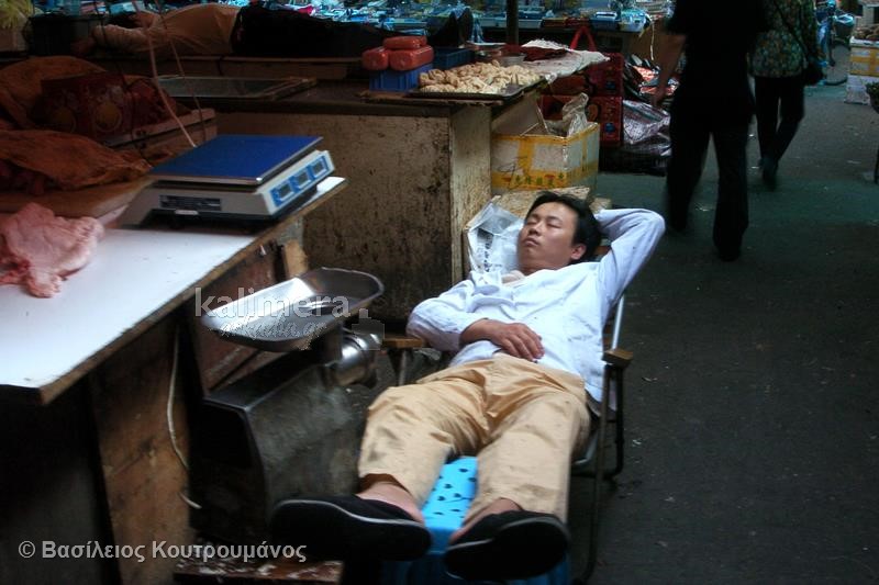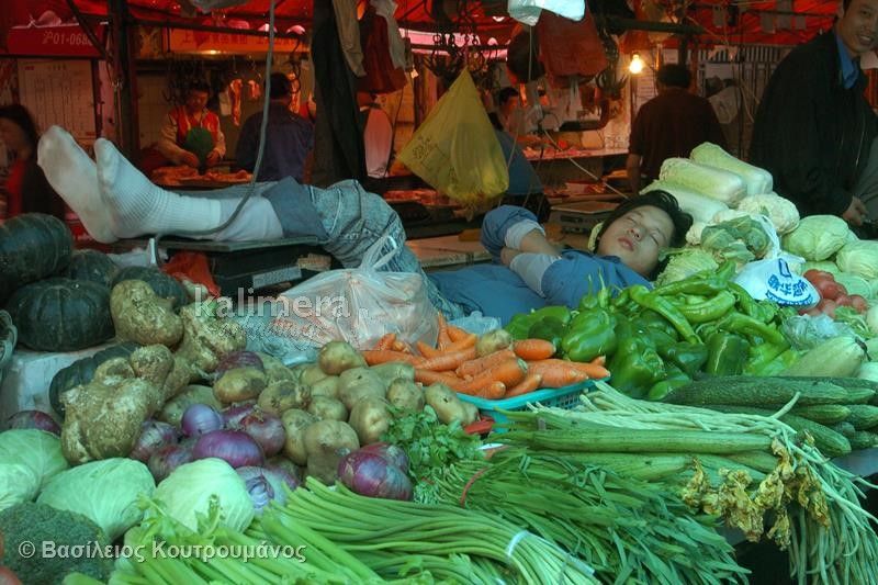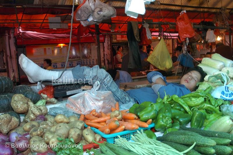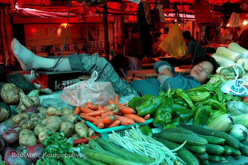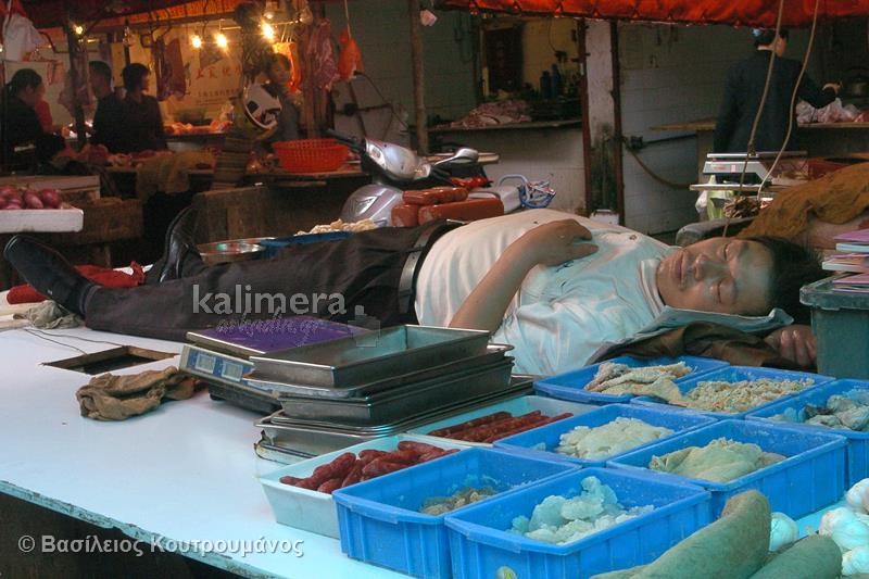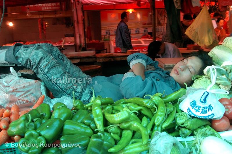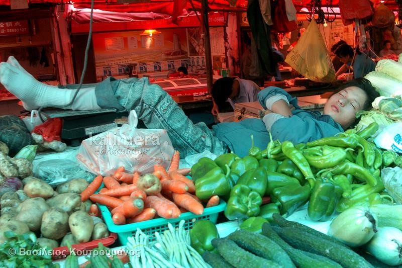 Μάλιστα, σε ορισμένες φωτογραφίες, Κινέζοι κοιμούνται ξυπόλητοι πάνω σε πάγκους με τρόφιμα και λαχανικά!