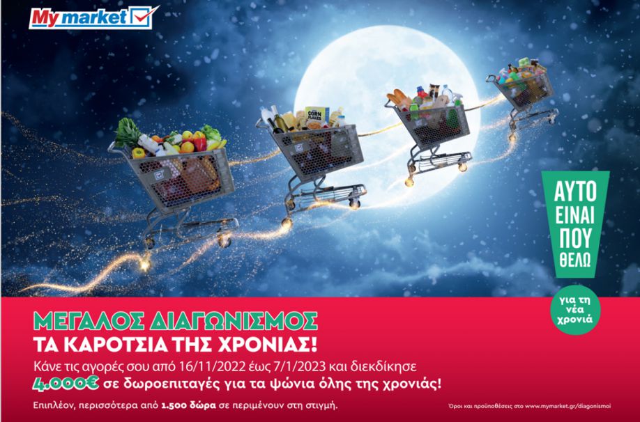 Τα My market φέτος τα Χριστούγεννα δημιουργούν για πρώτη φορά στην ιστορία τους μια 360ο εορταστική καμπάνια που γιορτάζει την πιο λαμπερή περίοδο του έτους. Η νέα καμπάνια με τίτλο «Τα Καρότσια της Χρονιάς» παρουσιάζει το μεγάλο εορταστικό διαγωνισμό του δικτύου με δώρα αξίας 4.000 ευρώ το καθένα για τα καρότσια ΟΛΗΣ της χρονιάς. Η μαγική καμπάνια μοιράζει άμεσα και καθημερινά δώρα που ξεπερνούν συνολικά τα 100.000 ευρώ.