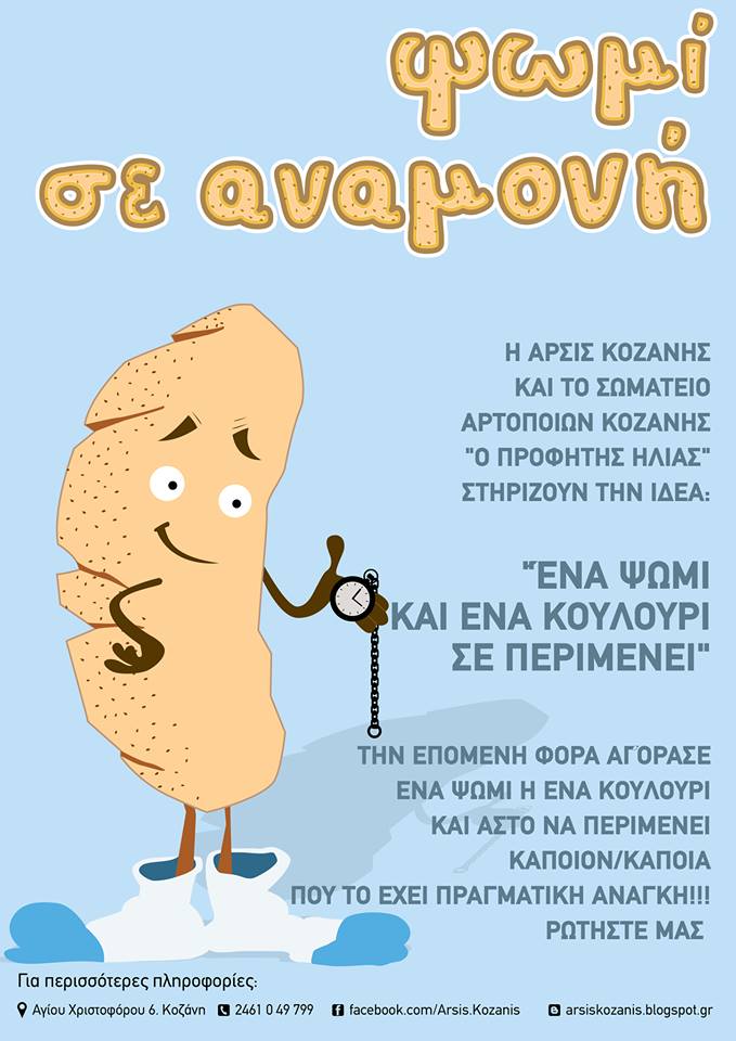 Το «Ψωμί που περιμένει» είναι μια προσπάθεια ανθρωπιάς κι αλληλεγγύης που υλοποιούν στην Κοζάνη το Σωματείο Αρτοποιών Κοζάνης «ο Προφήτης Ηλίας» και η ΑΡΣΙΣ Κοζάνης. Πιθανόν, να έχετε συναντήσει ανάλογες κινήσεις, να γιγαντώνονται σε ολόκληρη τη χώρα, με χαρακτηριστικά παραδείγματα: τον καφέ σε αναμονή, το γάλα και μια μερίδα φαγητό, ακόμη κι ένα κούρεμα! Η διακριτικότητα, ο σεβασμός, η ειλικρινής διάθεση και η καλή πίστη είναι κύριο μέλημα αυτής της προσπάθειας.
