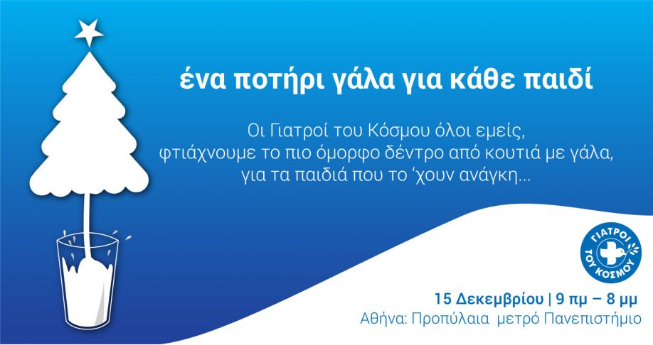 Οι Γιατροί του Κόσμου όλοι εμείς φτιάχνουμε το πιο όμορφο δέντρο απο κουτιά με γάλα, για τα παιδιά που το έχουν ανάγκηΤην Παρασκευή 15 Δεκεμβρίου 2017 και για 8η συνεχόμενη χρονιά στην Αθήνα, οι Γιατροί του Κόσμου θα στολίσουν το ξεχωριστό Χριστουγεννιάτικο Δέντρο τους από κουτιά με Γάλα στα Προπύλαια (μετρό Πανεπιστήμιο) από τις 9 το πρωί έως τις 8 το βράδυ.
