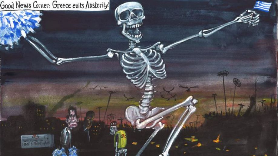 Το σκίτσο του Μάρτιν Ρόουσον έχει τίτλο «Καλά νέα: Η Ελλάδα εξέρχεται από την λιτότητα» και απεικονίζει τη χώρα μας ως έναν σκελετό που πανηγυρίζει, κρατώντας μια ελληνική σημαία, το τέλος της μνημονιακής περιόδου.