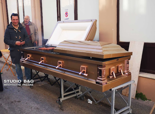 Το γραφείο τελετών του Αλέξανδρου Χρυσικού και του Βασίλη Καραφωτιά στο Ναύπλιο εξέπληξε του πάντες για μία ακόμα φορά, φτιάχνοντας μία ψησταριά... φέρετρο!!!
