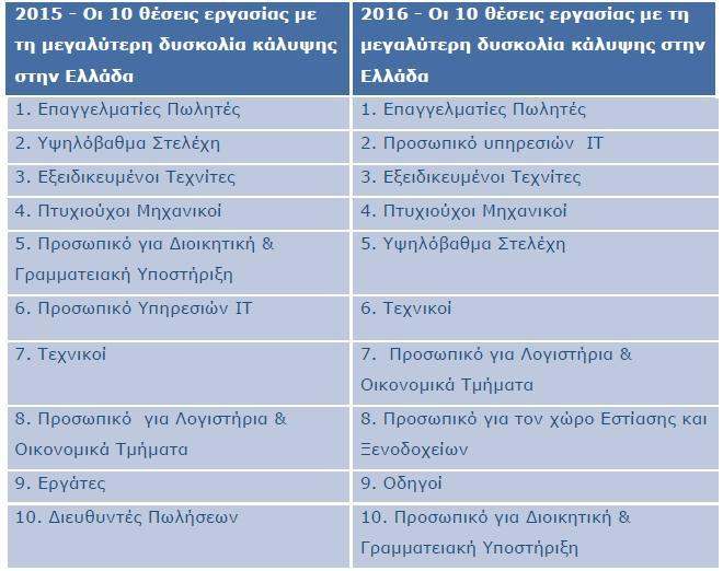 Για όγδοη συνεχή χρονιά οι εργοδότες στην Ελλάδα αντιμετωπίζουν τη μεγαλύτερη δυσκολία στην κάλυψη θέσεων στον τομέα των «Επαγγελματιών Πωλητών», ενώ ακολουθεί η ειδικότητα του «Προσωπικού Υπηρεσιών IT», η οποία βρισκόταν στην 6η θέση της κατάταξης το 2015.
