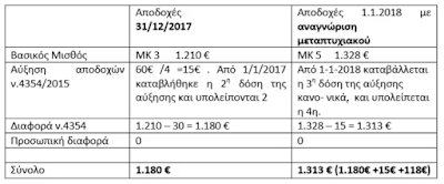Αποδοχές 1.1.2018 με αναγνώριση μεταπτυχιακού Βασικός Μισθός ΜΚ 3 1.210 € ΜΚ 5 1.328 € Αύξηση αποδοχών ν.4354/2015 60€ /4 =15€ . Από 1/1/2017 καταβλήθηκε η 2η δόση της αύξησης και υπολείπονται 2 Από 1-1-2018 καταβάλλεται η 3η δόση της αύξησης κανο- νικά, και υπολείπεται η 4η. Διαφορά ν.4354 1.210 – 30 = 1.180 € 1.328 – 15 = 1.313 € Προσωπική διαφορά 0 0 Σύνολο 1.180 € 1.313 € (1.180€ +15€ +118€)