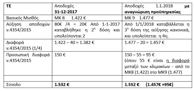 Για τον υπάλληλο αυτό, αν στο διάστημα των 14 χρόνων και 10 μηνών που προσμετρήθηκε για την κατάταξη του προσθέσουμε το διάστημα των 2 χρόνων και έξι μηνών προϋπηρεσίας που αναγνώρισε, ο συνολικός χρόνος για κατάταξη σε ΜΚ είναι πλέον 17 χρόνια και 4 μήνες, επομένως από 1-1-2018 που ισχύουν τα οικονομικά αποτελέσματα αναγνώρισης προϋπηρεσίας, θα καταταγεί πλέον στο ΜΚ 9 με πλεονάζοντα χρόνο 4 μήνες. Η διαφορά του κλιμακίου που είναι 55€ θα μειώσει την προσωπική διαφορά και παράλληλα θα του χορηγηθεί και το ¼ της αύξησης.