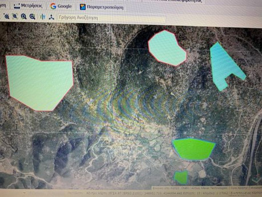 Δεν έχει τέλος η υποβάθμιση του χωριού μας από τα ΑΠΕ. Μετά τις δύο βιομηχανικές μονάδες αποθήκευσης ηλεκτρικής ενέργειας (πράσινες περιοχές στη φωτογραφία) για τις οποίες αγωνιζόμαστε με ότι καλύτερο μπορούμε να μην έρθουν, αδειοδοτούνται δύο νέες φωτοβολταικές εγκαταστάσεις στα βουνά που μας περιβάλλουν. (ανοικτό γαλάζιο). Το σκούρο γαλάζιο είναι το υπάρχον φωτοβολταικό πάρκο. Και βέβαια μη ξεχνάμε την άδεια τοποθέτησης ανεμογεννητριών στο βουνό του Άγιου Παντελεήμονα που είναι σε αναμονή. ΜΙΛΑΜΕ ΠΛΕΟΝ ΓΙΑ ΠΕΡΙΚΥΚΛΩΣΗ ΤΟΥ ΧΩΡΙΟΥ ΜΑΣ ΑΠΟ ΑΠΕ.