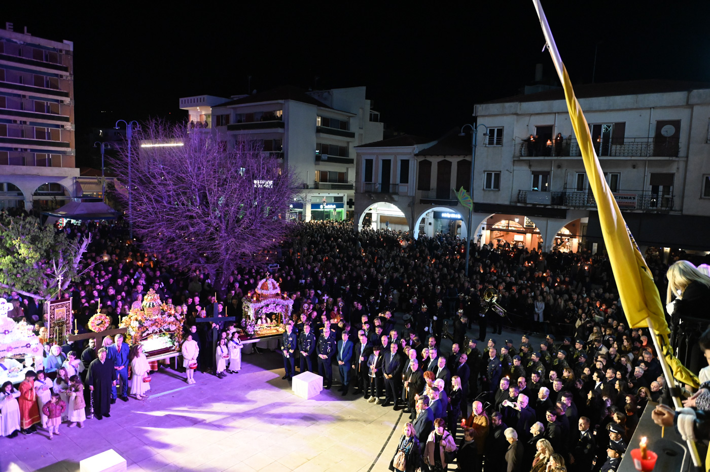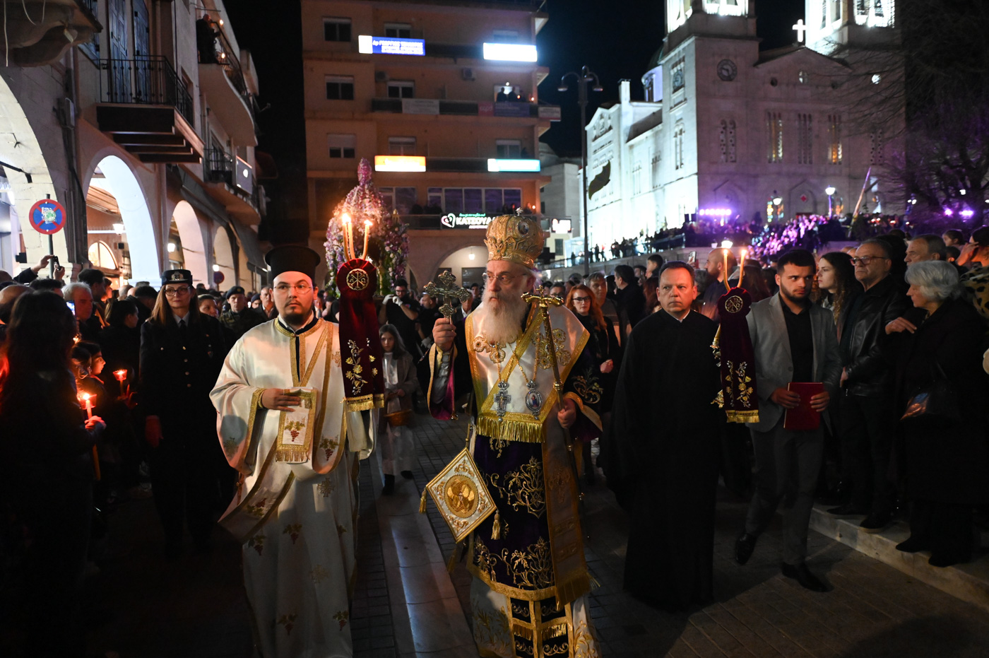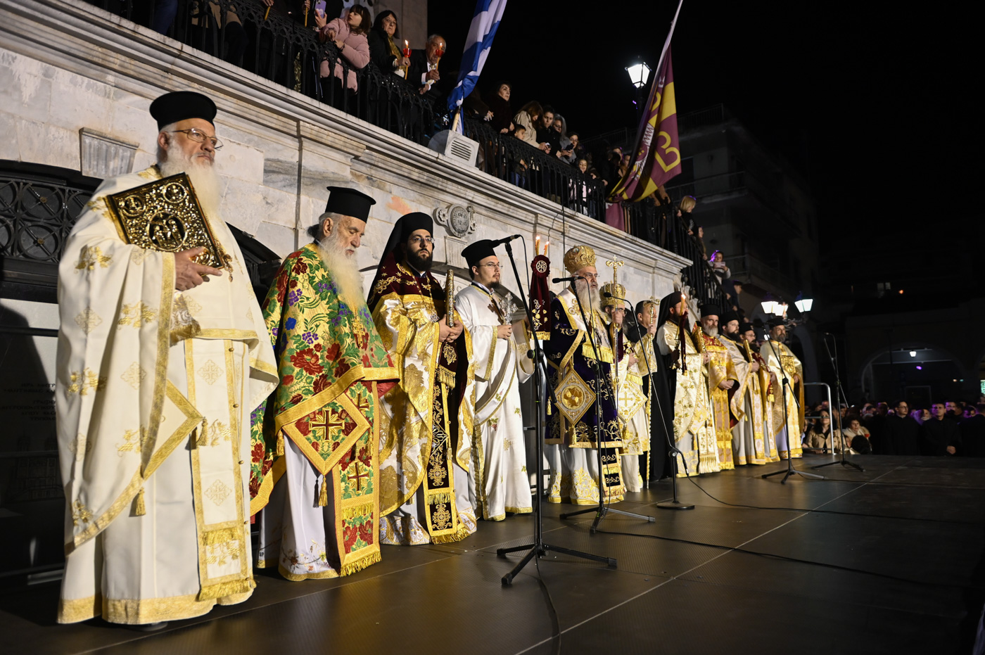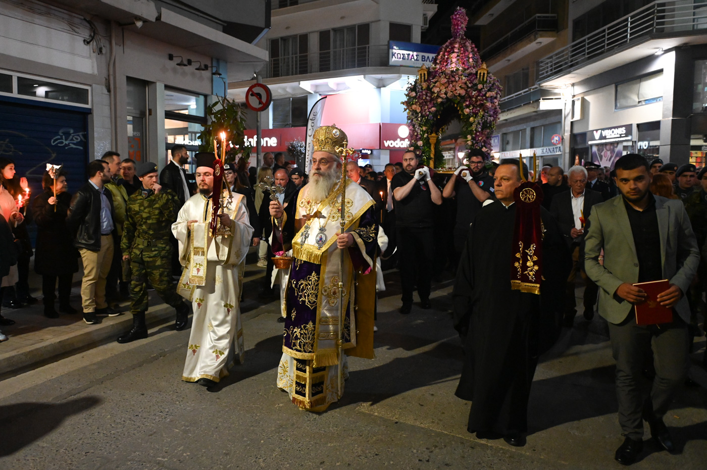 Ακολούθως, τελέσθηκε η περιφορά του Επιταφίου πέριξ του Μητροπολιτικού Ναού, όπου έμπροσθεν αυτού, στην κεντρική πλατεία πραγματοποιήθηκε η συνάντηση των Επιταφίων ενοριών της Τρίπολης. Ο Μητροπολίτης κ. Επιφάνιος, συμπαραστατούμενος από τον Θεοφιλ. Επίσκοπο Τεγέας και από Ιερείς ανέπεμψαν δέηση ενώπιον πλήθους πιστών που κατέκλυσαν την κεντρική πλατεία.