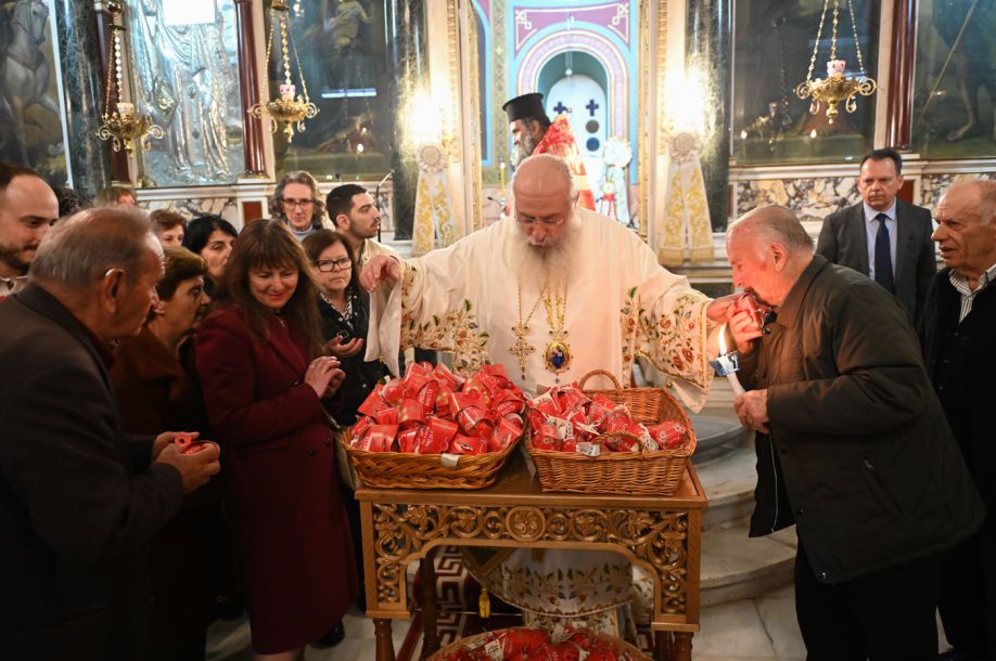 Με το πέρας του Εσπερινού ο Μητροπολίτης διένειμε σε Ιερείς, άρχοντες και πιστούς κόκκινα αυγά αναφωνώντας τον Αναστάσιμο χαιρετισμό “Χριστός Ανέστη”.