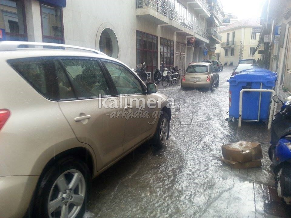 Η ισχυρή καταιγίδα και η χαλαζόπτωση δημιούργησαν προβλήματα σε κεντρικούς δρόμους της Τρίπολης, τα οποία εμφάνισαν πλημμυρικά φαινόμενα.
