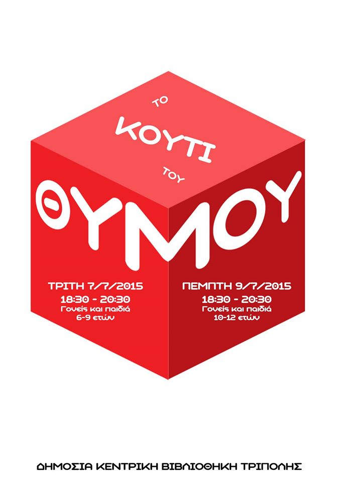 Το εκπαιδευτικό πρόγραμμα «Το κουτί του θυμού» πραγματοποίησε η Δημόσια Κεντρική Βιβλιοθήκη Τρίπολης στις 7-7-2015 και 9-7-2015. Το πρόγραμμα, στο οποίο συμμετείχαν γονείς και παιδιά, υλοποιήθηκε από τη φιλόλογο κ. Μαρία Μάγκλαρη.