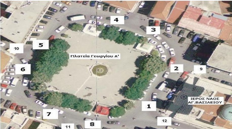 1. Στην οδό Κύπρου, Ουάσιγκτον, Εθνομαρτύρων, Γεωργίου Α’, επί του σημείου που εισέρχονται στην πλατεία κάθετα στους εν λόγω δρόμους συνδέοντας τα πεζοδρόμια (θέσεις 9, 10, 11, 12).