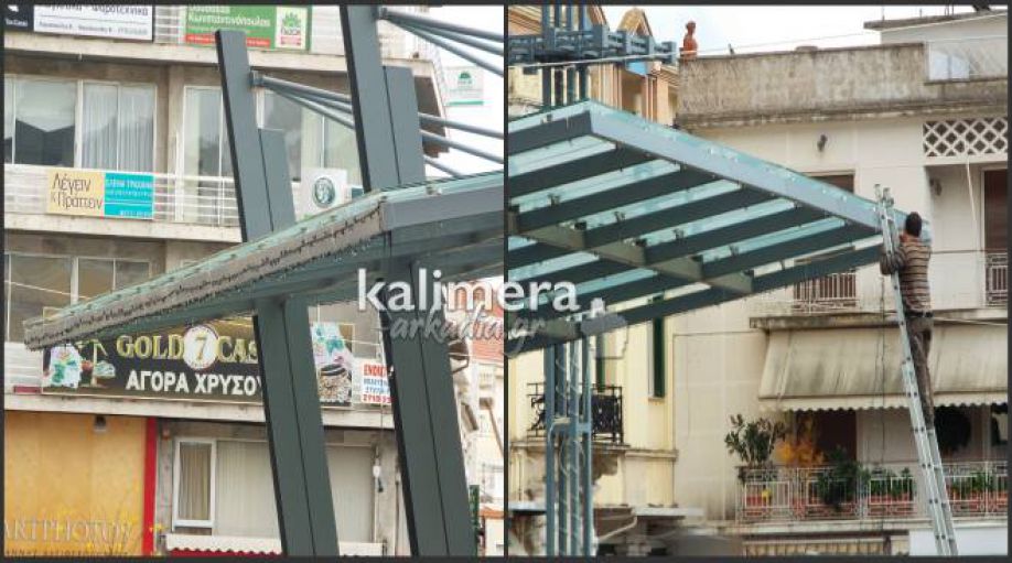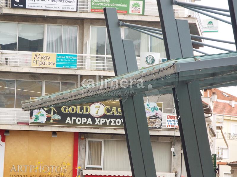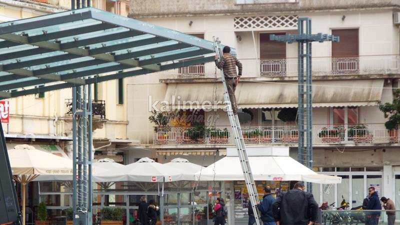 Σήμερα στην Πλατεία Πετρινού, στις γύρω κολόνες άλλα και στο σκέπαστρο, από το πρωί, συνεργεία του δήμου τοποθετούσαν τα λαμπιόνια.