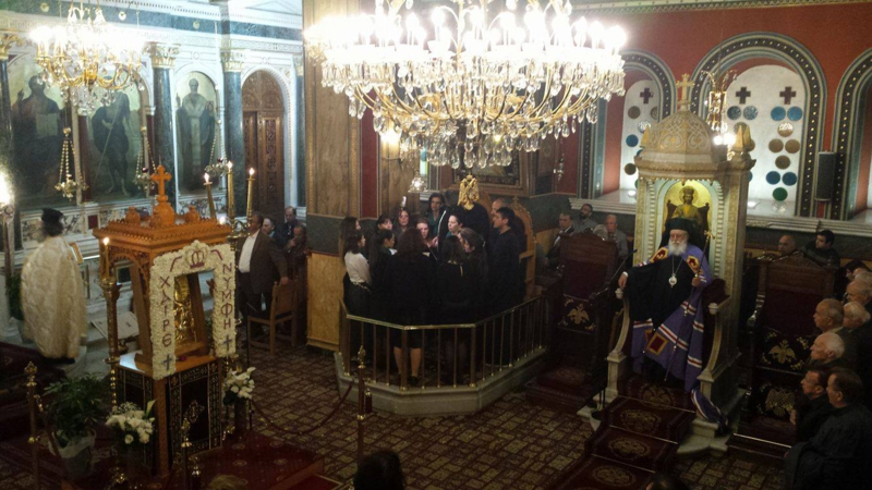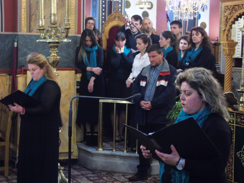 Τούς ὕμνους πρός τήν Θεοτόκο ἔψαλαν τά νέα παιδιά μας, πού ἀπαρτίζουν τήν Μικτή Χορωδία τῆς Ἱερᾶς Μητροπόλεως, ὑπό τήν καθοδήγηση τοῦ χοράρχου αὐτῆς καί Πρωτοψάλτου τοῦ Μητροπολιτικοῦ Ιεροῦ Ναοῦ Ἁγίου Βασιλείου Τριπόλεως κ. Βασιλείου Γεωργαρᾶ.