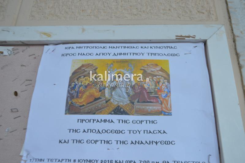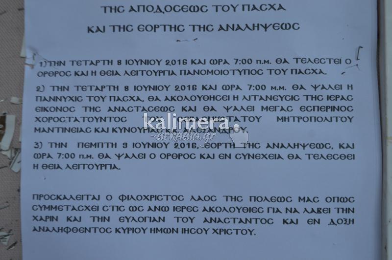 Αμέσως μετά τον εσπερινό, έγινε περιφορά της εικόνας Αναλήψεως του Κυρίου γύρω από τον Ναό με τη συνοδεία της Φιλαρμονικής του δήμου Τρίπολης και πλήθος πιστών.
