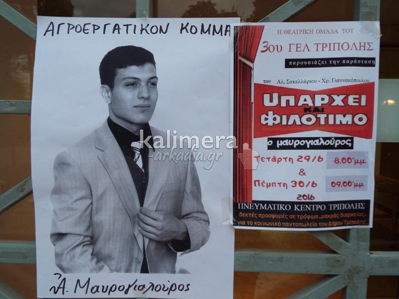 Η θεατρική ομάδα του 3ου Γενικού Λυκείου Τρίπολης παρουσιάζει την παράσταση του Αλέκου Σακελλάριου και του Χρήστου Γιαννακόπουλου «Υπάρχει και Φιλότιμο», στο αμφιθέατρο του Αποστολοπούλειου Πνευματικού κέντρου Τρίπολης.