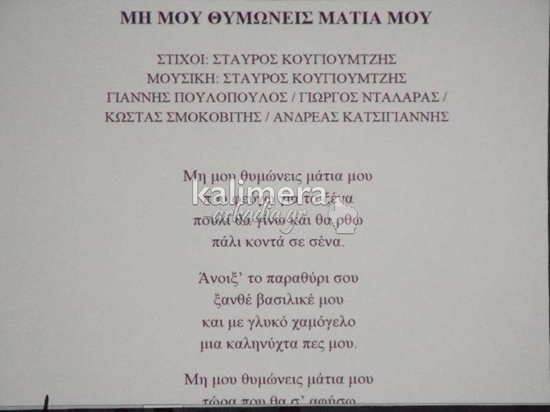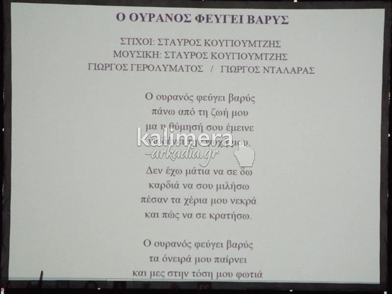 Κάτω από το πανέμορφο φεγγάρι, μια μουσική βραδιά, αφιερωμένη στον Σταύρο Κουγιουμτζή, με όχημα τα τραγούδια του μεγάλου σύνθετη, ταξίδεψε το κοινό της Τρίπολης, που γέμισε το θέατρο του Άλσους Αγίου Γεωργίου.