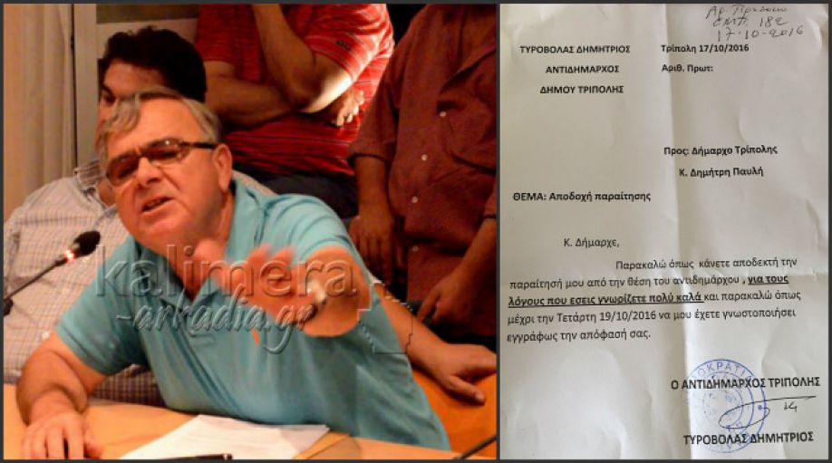 Η παραίτηση του Δημήτρη Τυροβολά, από τη θέση του Αντιδημάρχου, κατατέθηκε επίσημα σήμερα (Δευτέρα, 17 Οκτωβρίου 2016). Στην επιστολή παραίτησής του, προς τον Δήμαρχο, ο κ. Τυροβολάς ζητά να γίνει αποδεκτή η παραίτησή του, λέγοντας προς τον Δημήτρη Παυλή "για τους λόγους που εσείς γνωρίζετε πολύ καλά και παρακαλώ όπως μέχρι την Τετάρτη 19 Οκτωβρίου να μού έχετε γνωστοποιήσει εγγράφως την απόφασή σας".