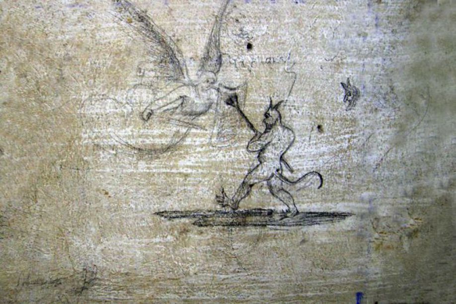 Ζωγραφιές στον τοίχο του υπογείου του δικαστηρίου Τρίπολης απο τον Τάκη Αλεβίζο ως κρατούμενος το 1949 (φωτ. Ευάγγελος Μαντζουράνης)