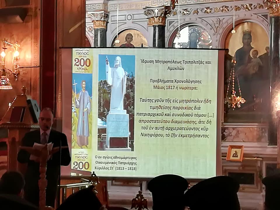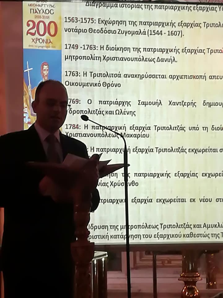 Τὴν Κυριακή 25 Νοεμβρίου 2018 μετά τήν ἀκολουθία τοῦ Ἑσπερινοῦ εἰς τόν Μητροπολιτικόν Ἱερόν Ναόν τοῦ Ἁγίου Βασιλείου Τριπόλεως καί εἰς τό πλαίσιο τῶν ἐκδηλώσεων τοῦ ἐπετειακοῦ ἑορτασμοῦ τῶν διακοσίων ἐτῶν ἀπό τό μαρτύριον τοῦ Ἁγίου Νεομάρτυρος Παύλου, Πολιούχου Τριπόλεως, ἐπραγματοποιήθηκε ὀμιλία ἀπό τόν κ. Δημήτριο Βαχαβιώλο Διδάκτορα Βυζαντινῆς Ἰστορίας.