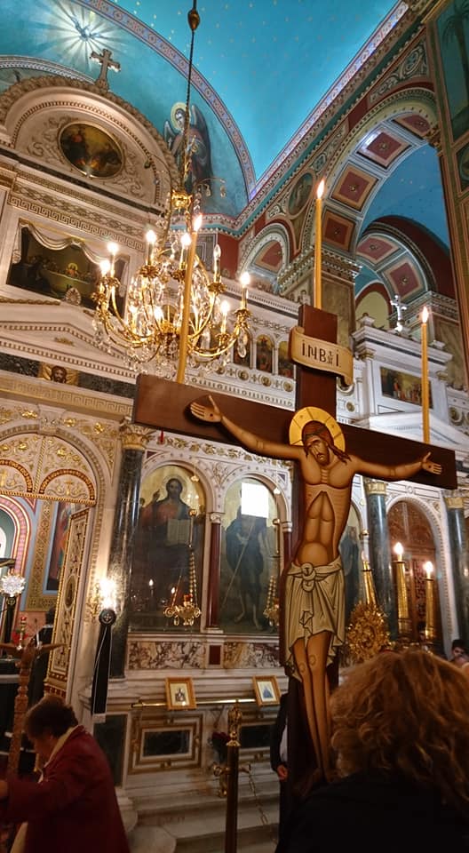 «Ἐξηγόρασας ἡμᾶς, ἐκ τῆς κατάρας τοῦ νόμου, τῷ τιμίῳ Σου Αἵματι· τῷ Σταυρῷ προσηλωθείς, καὶ τῇλόγχῃ κεντηθείς, τὴν ἀθανασίαν ἐπήγασας ἀνθρώποις· Σωτὴρ ἡμῶν δόξα Σοι».