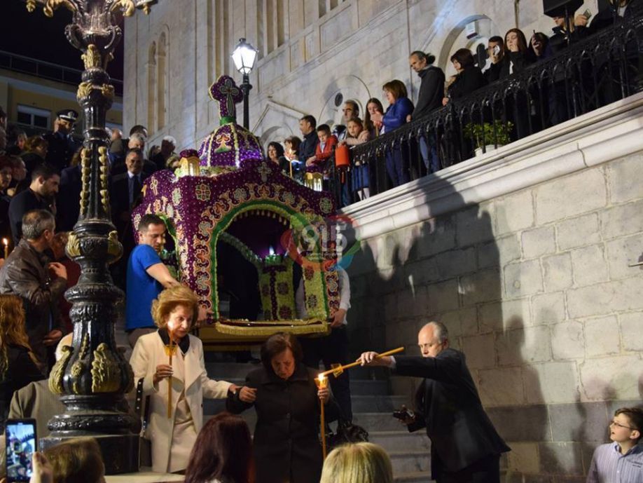 Στην πλατεία Αγίου Βασιλείου, με συνοδεία Ιεροψαλτών, έγινε η κατανυκτική λιτάνευση και συνάντηση των Επιταφίων και των ενοριτών όλων των ιερών Ναών της πόλης με τον Επιτάφιο τού Μητροπολιτικού Ι. Ν. Αγίου Βασιλείου, που έχει αναδειχθεί ως ένας από τους πιο ιδιαίτερους σε στολισμό στην Ελλάδα.