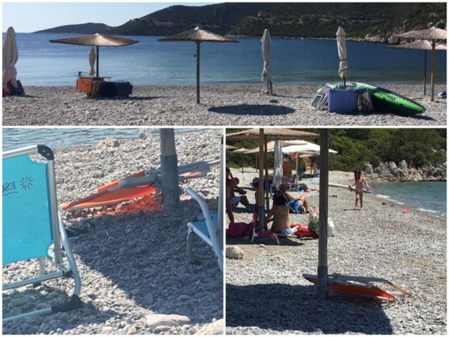 Με λύπη μας διαπιστώσαμε ότι εν μέσω πλήρους τουριστικής περιόδου, άγνωστοι ιδιώτες αφήνουν τις ομπρέλες τους και διάφορα άλλα συναφή αντικείμενα (καρέκλες τραπεζάκια κ.λπ.) στον αιγιαλό, συχνά με κατασκευές - πατέντες που τα σταθεροποιούν στο έδαφος μέχρι την επόμενη φορά που θα επιστρέψουν για να κάνουν το μπάνιο τους, θεωρώντας ότι η παραλία τους ανήκει και καταλαμβάνουν έτσι, μόνιμα και παράτυπα τον χώρο σε βάρος όλων των άλλων λουομένων.