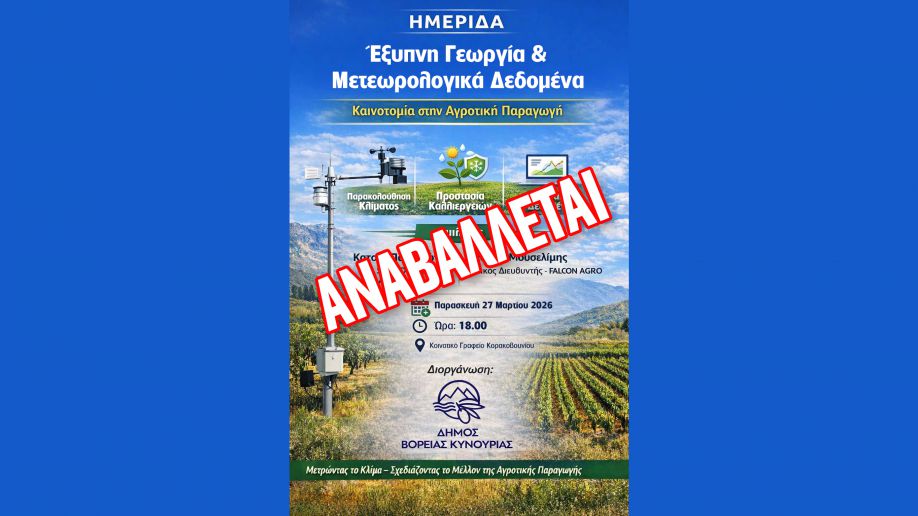 Ο Δήμος Βόρειας Κυνουρίας ενημερώνει ότι η προγραμματισμένη ενημερωτική ημερίδα με θέμα «Έξυπνη Γεωργία & Μετεωρολογικά Δεδομένα – Καινοτομία στην Αγροτική Παραγωγή», αναβάλλεται.