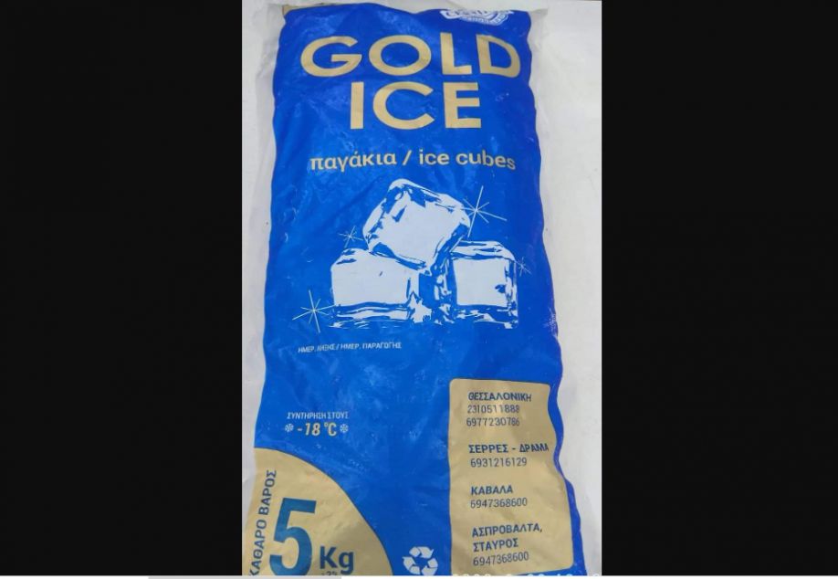 Παγάκια συσκευασμένα GOLD ICE, σε κλειστή πλαστική συσκευασία 5 κιλών, με ημερομηνία παραγωγής 24-09-2020 και ημερομηνία λήξης 24-10-2021, το οποίο παράγεται από την επιχείρηση ΤΣΕΡΤΣΕΝΕΣ ΓΕΩ. ΕΥΑΓΓΕΛΟΣ, ΑΣΣΗΡΟΣ (ΔΗΜΟΥ ΛΑΓΚΑΔΑ) ΘΕΣΣΑΛΟΝΙΚΗΣ και διανέμεται από την επιχείρηση ΠΑΠΑΖΟΓΛΟΥ ΔΗΜ. ΖΗΝΟΒΙΑ, Περιοχή Παραλίμνιο Σερρών.