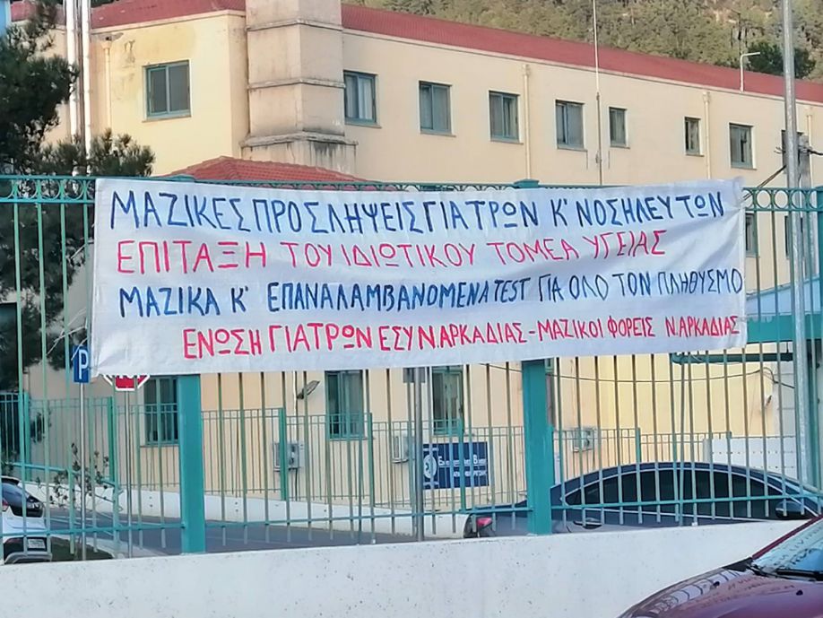 Πανό για προσλήψεις και test covid για όλο τον πληθυσμό στο Παναρκαδικό Νοσοκομείο!